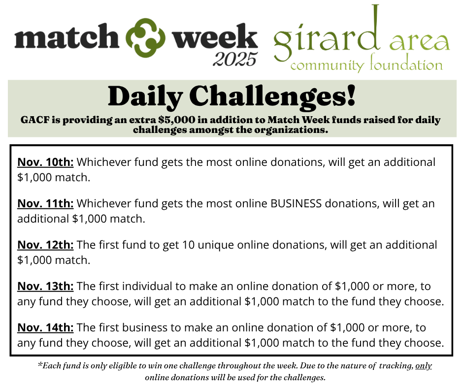 The Girard Area Community Foundation (GACF) is expanding it’s annual Match Day event into Match Week, taking place from Monday, November 10 through Friday, November 14, 2025! Match Week is an exciting fundraising campaign to help provide matching funds for community contributions to participating charitable funds.